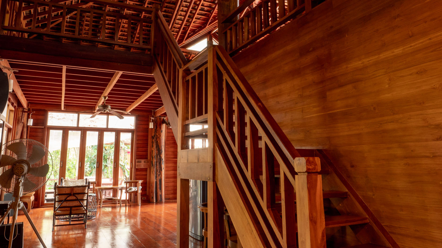 เป็นบ้านไม้สักหลังใหญ่ 2 ชั้น มีห้องโถงและระเบียงติดลำธารลำตะคอง ซึ่งมีต้นน้ำไหลลงมาจากเขาใหญ่ มีจุดชมวิวบนดาดฟ้า กางเต๊นท์นอนได้ บรรยากาศร่มรื่น หน้าบ้านมีลานระเบียงไม้ กว้าง 12 x 12 เมตร ใช้จัดบุฟเฟต์อาหารเช้า